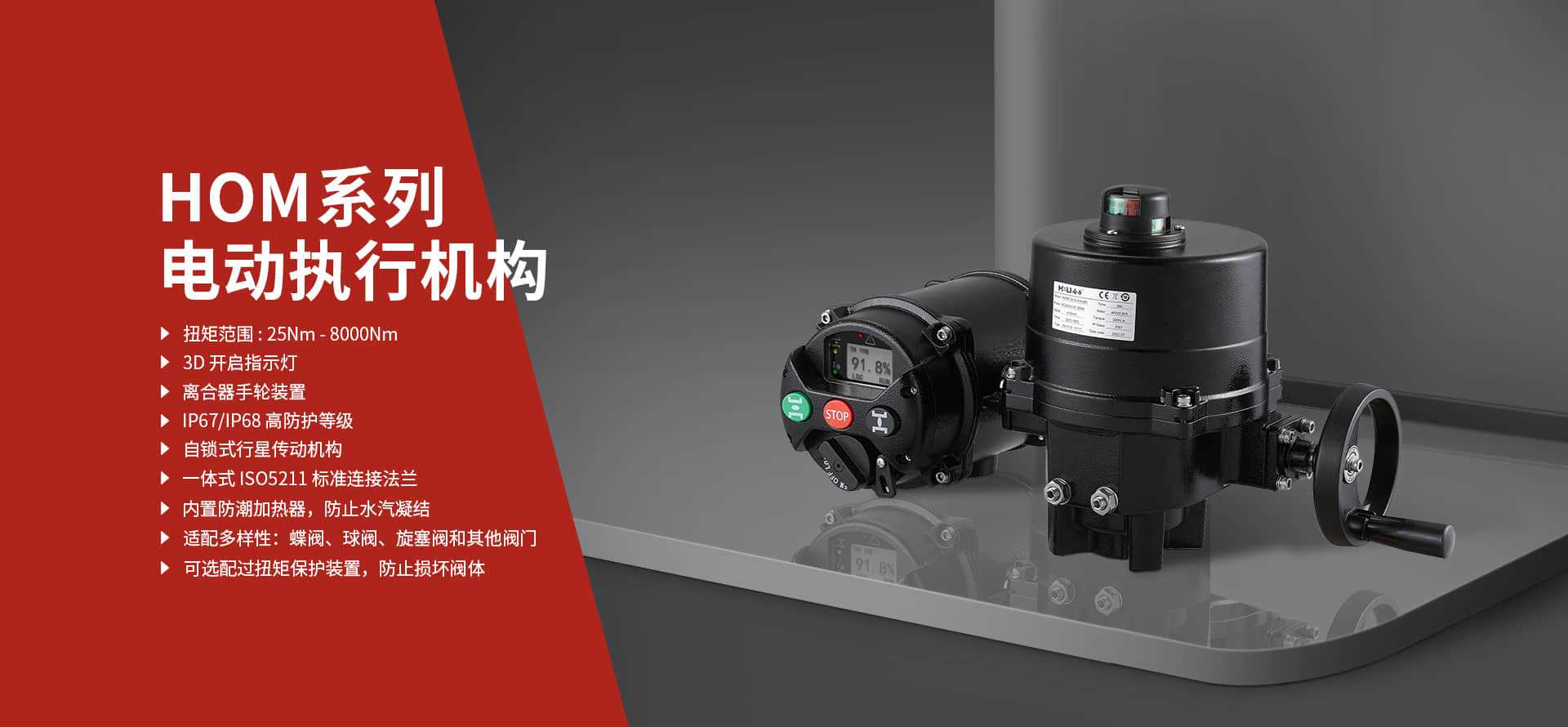 HOM系列帶行星齒輪的部分回轉(zhuǎn)電動(dòng)執(zhí)行機(jī)構(gòu),用于機(jī)械傳動(dòng)。輸出扭矩為25~8000NM,無離合器手動(dòng)操作。手動(dòng)和電動(dòng)分別操作。它在沒有手柄或離合器的情況下很容易操作,當(dāng)電源打開時(shí),你可以轉(zhuǎn)動(dòng)手輪。電動(dòng)執(zhí)行機(jī)構(gòu)可與蝶閥、球閥、旋塞閥組合,廣泛應(yīng)用于發(fā)電廠/冶金廠/污水處理廠/樓宇自動(dòng)化/城市管網(wǎng)等管道系統(tǒng)